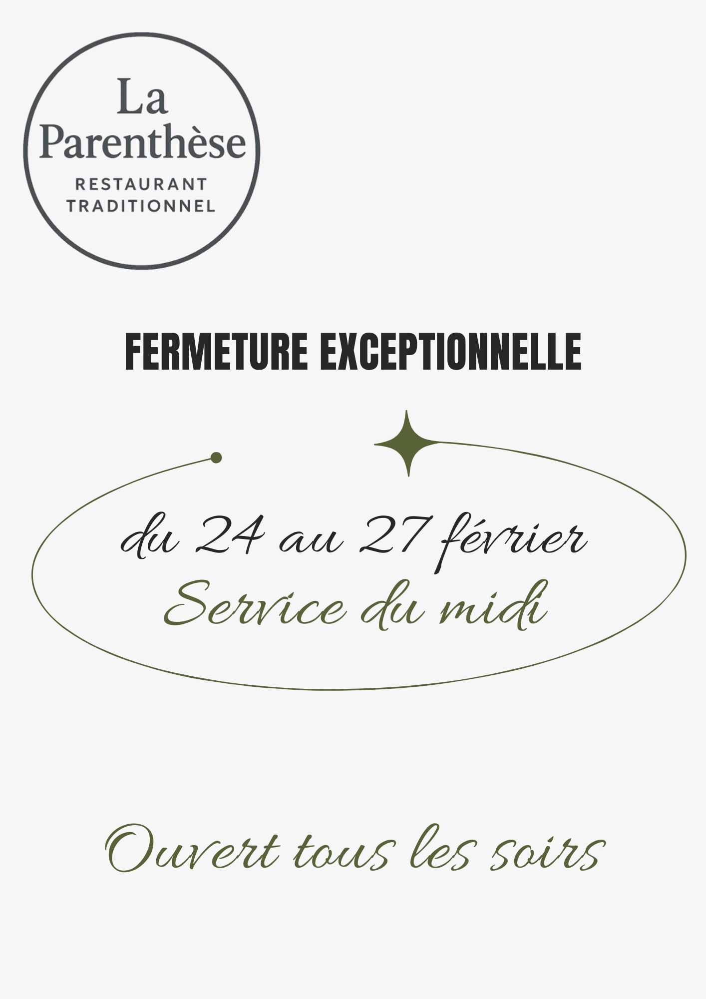 Fermeture exceptionnelle les midis / Ouvert tous les soirs